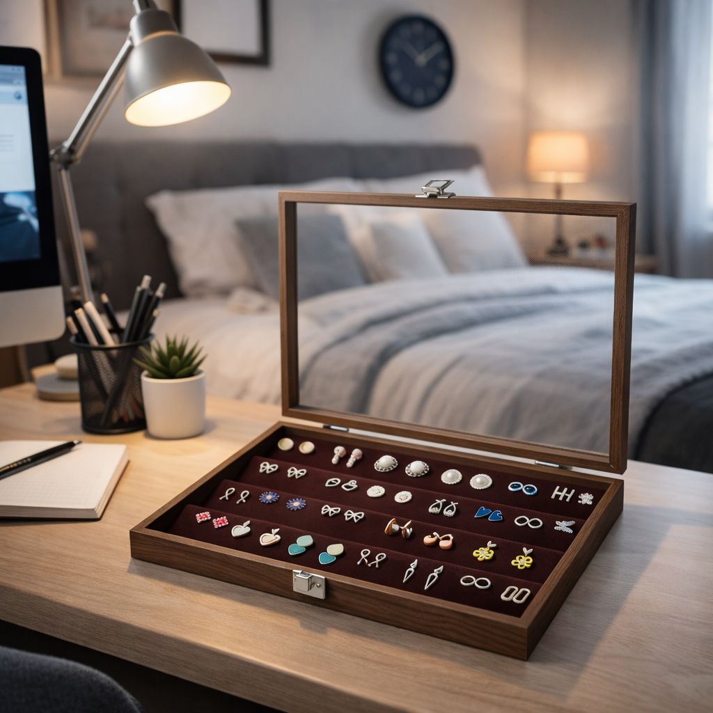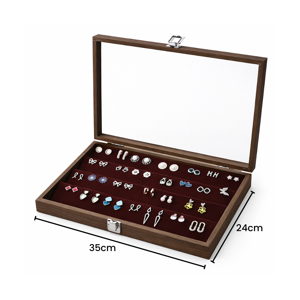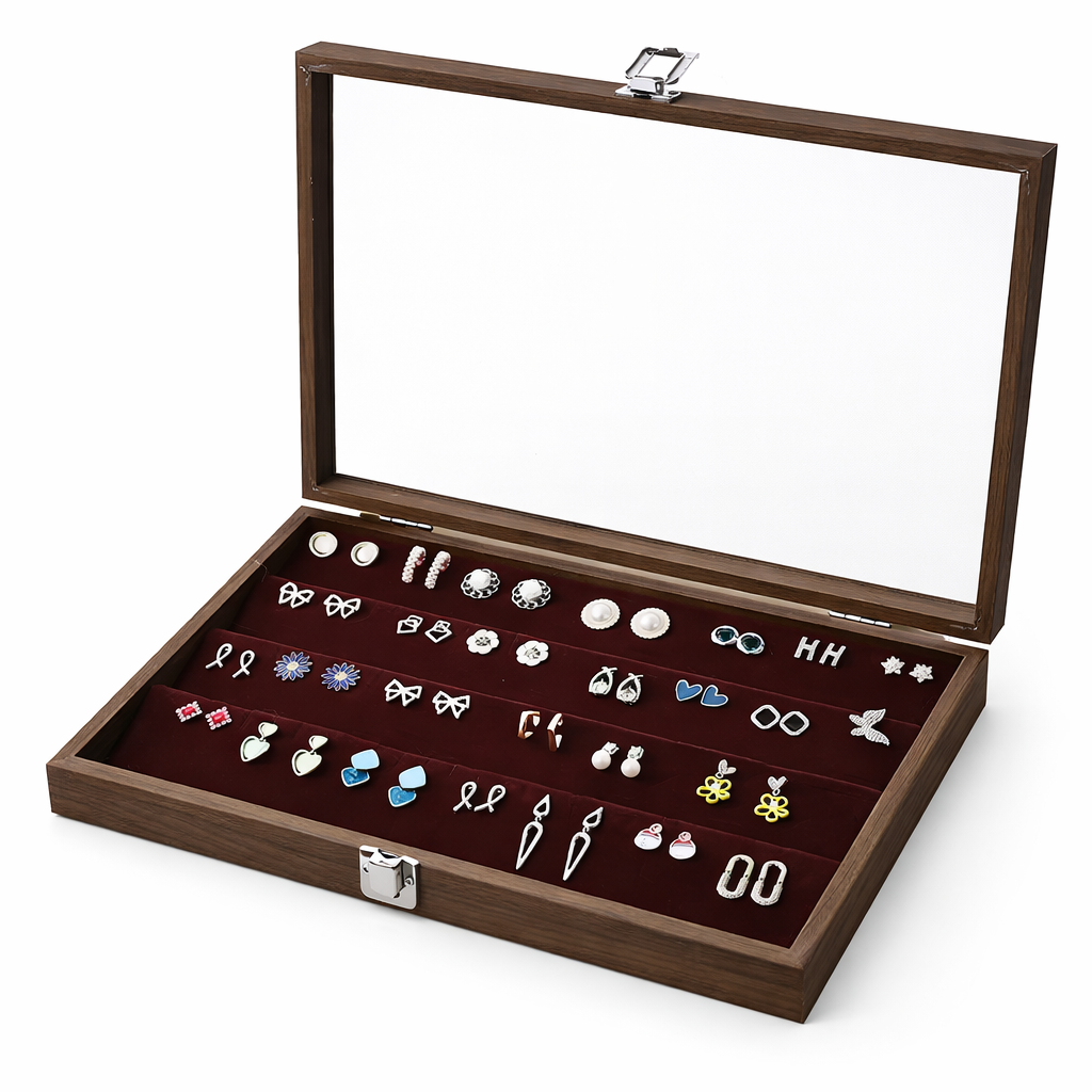 Boîte à boucles d’oreilles en bois avec couvercle transparent et rangées
